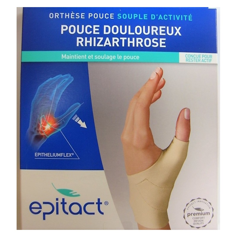 Indications : Pendant la journée, le pouce semble au repos alors qu'il est soumis à des micro-mouvements répétés. Ceux-ci contribuent à l'évolution de la rhizarthrose et peuvent déclencher des poussées inflammatoires douloureuses. Le port quotidien de l'orthèse souple d'activité Epitact aide à soulager les douleurs articulaires à la base du pouce, en limitant les micro-mouvements traumatisants.