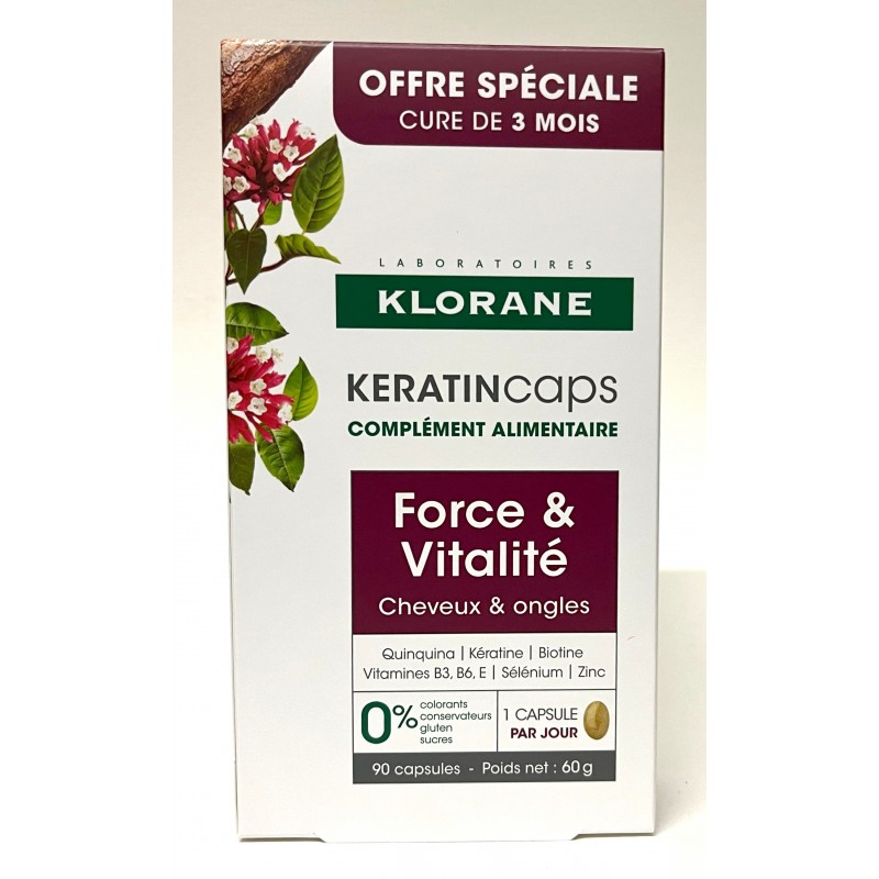 KERATINcaps, un complément alimentaire Klorane qui donne force et vitalité à vos cheveux et à vos ongles grâce aux nutriments et vitamines qui nourrissent le bulbe capillaire.