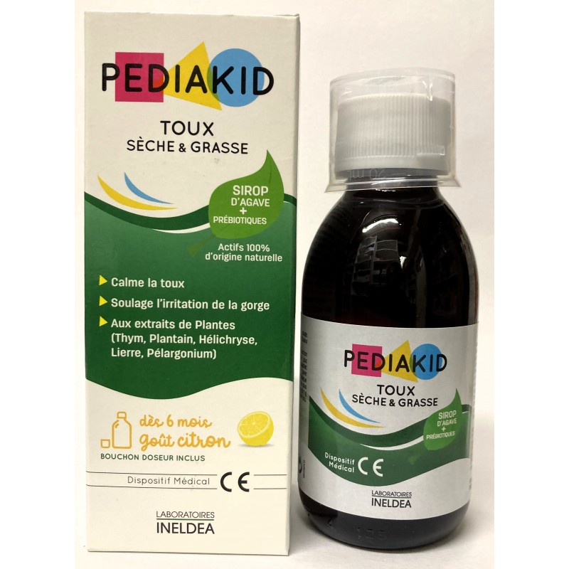- Le Sirop Toux PEDIAKID contient également des extraits de Thym, Plantain, Hélichryse, Lierre et Pélargonium.